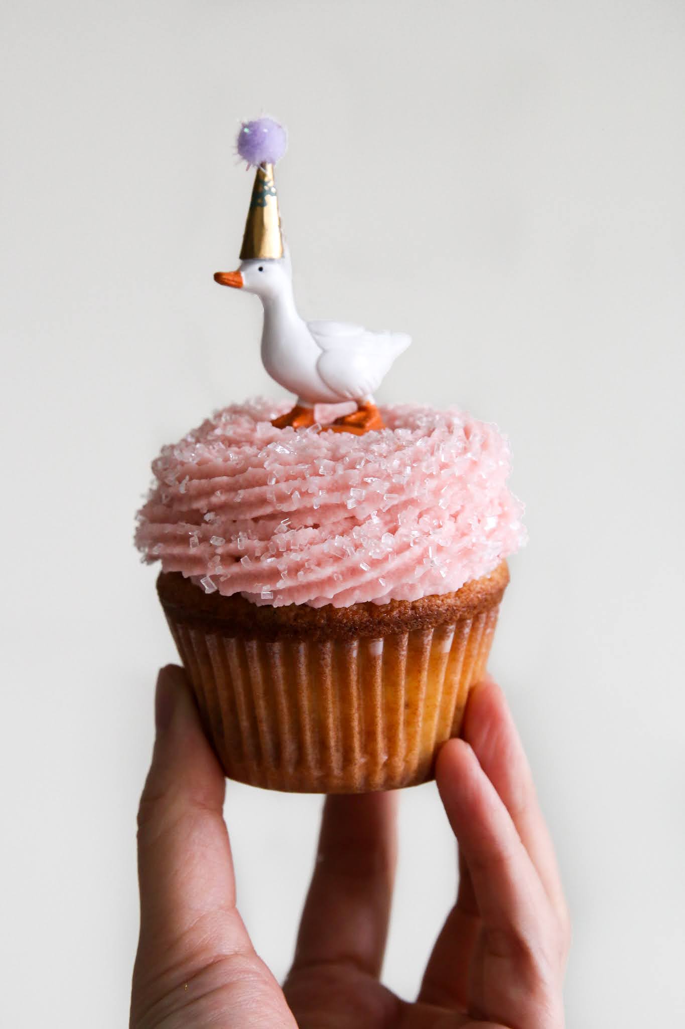 - Pipe two rings of buttercream on each cupcake and sprinkle sanding sugar on the buttercream.