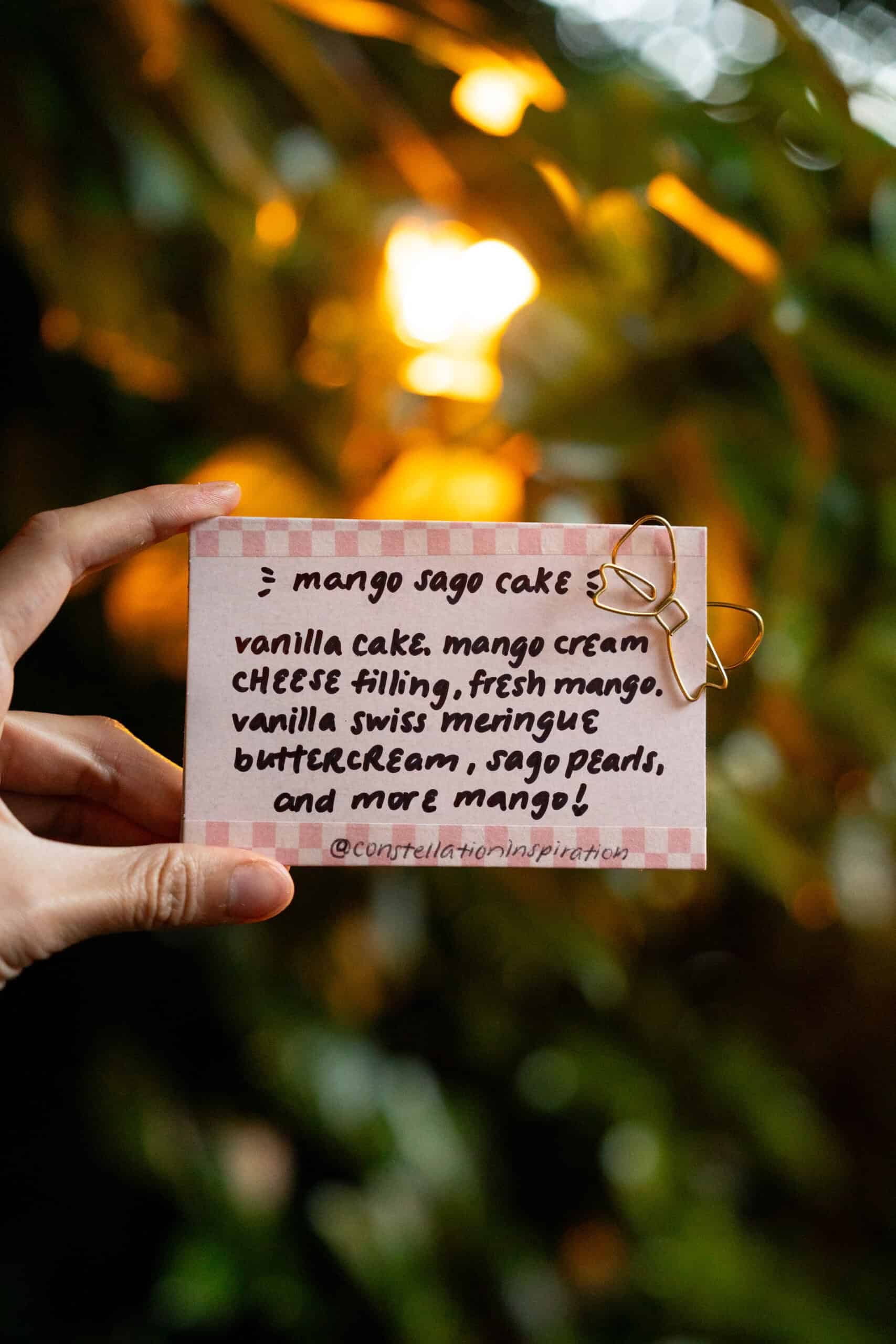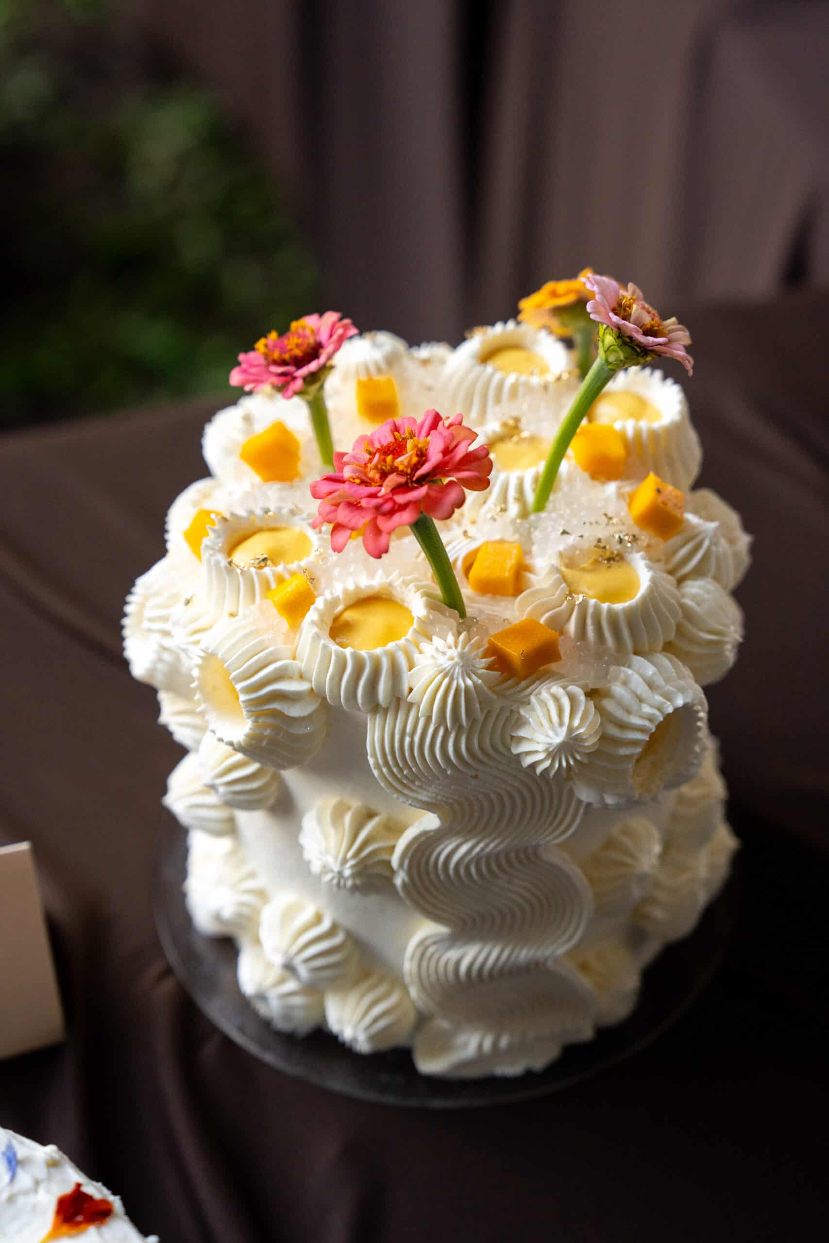 The cake I brought was inspired by one of my favourite Chinese desserts, mango sago. I recently made a mango sago pie and my goal for this cake was to capture the essence of mango sago as well as use some of the components in that pie recipe. I decided to make my cake the morning of the social so the cake is as fresh as can be. Things were off to a rocky start (cake layers got stuck in their pans and I stepped in some broken glass), but after a second round of baking, I had all the components for my mango sago cake. I made four layers of vanilla cake, and between each layer of cake was a mango cream cheese filling, fresh mangoes, and vanilla Swiss meringue buttercream. The cake was topped with sago pearls and more fresh mangoes. My go-to decorating style for layered cakes is a naked cake with fresh florals, but for this cake, I wanted to use decorating techniques I haven’t tried before. I knew I wanted a big squiggle of buttercream going down the sides of the cake and buttercream nests for dollops of the mango cake filling. Using a wide ribbon piping tip and Sultan piping tip achieved just that (after some redos because who knew piping a squiggle ribbon at a 90 degree angle was such a science?!). I finished the cake with some edible gold and glitter spray so the cake would glimmer in the setting sun.