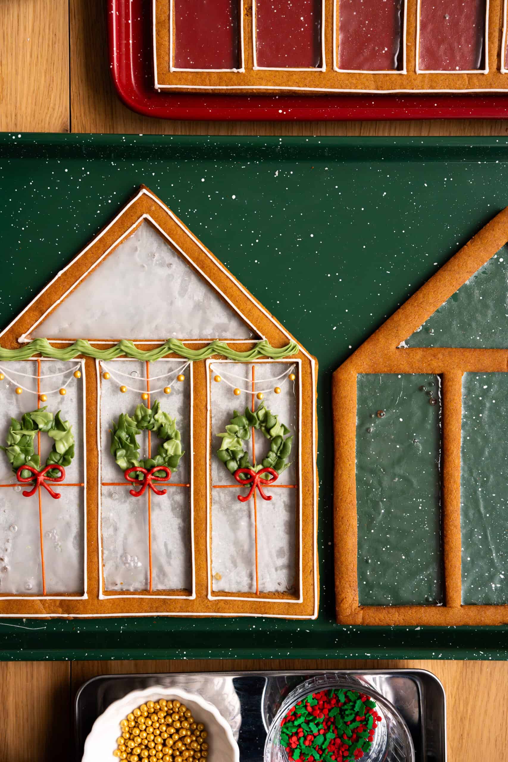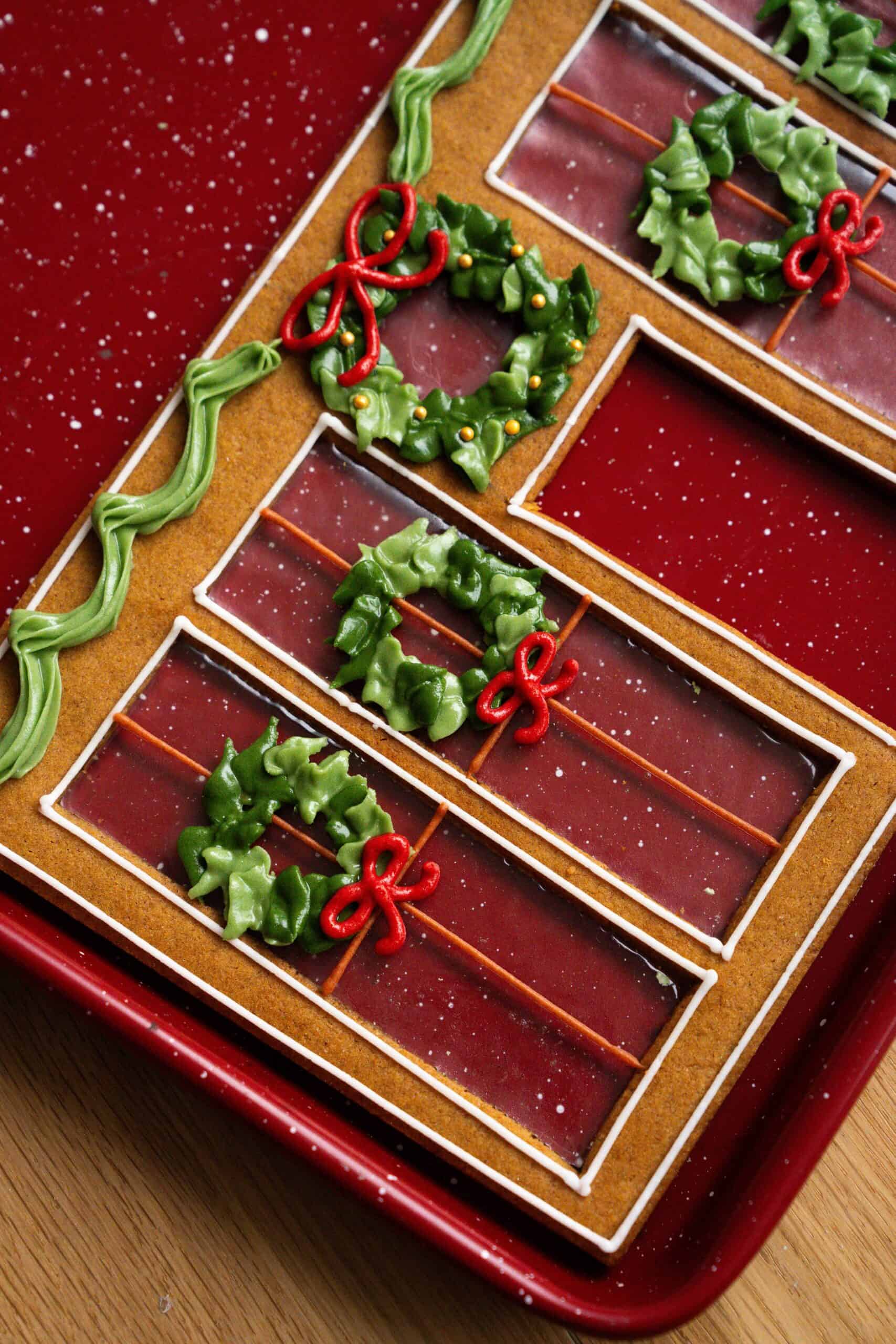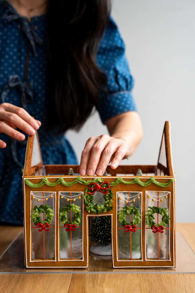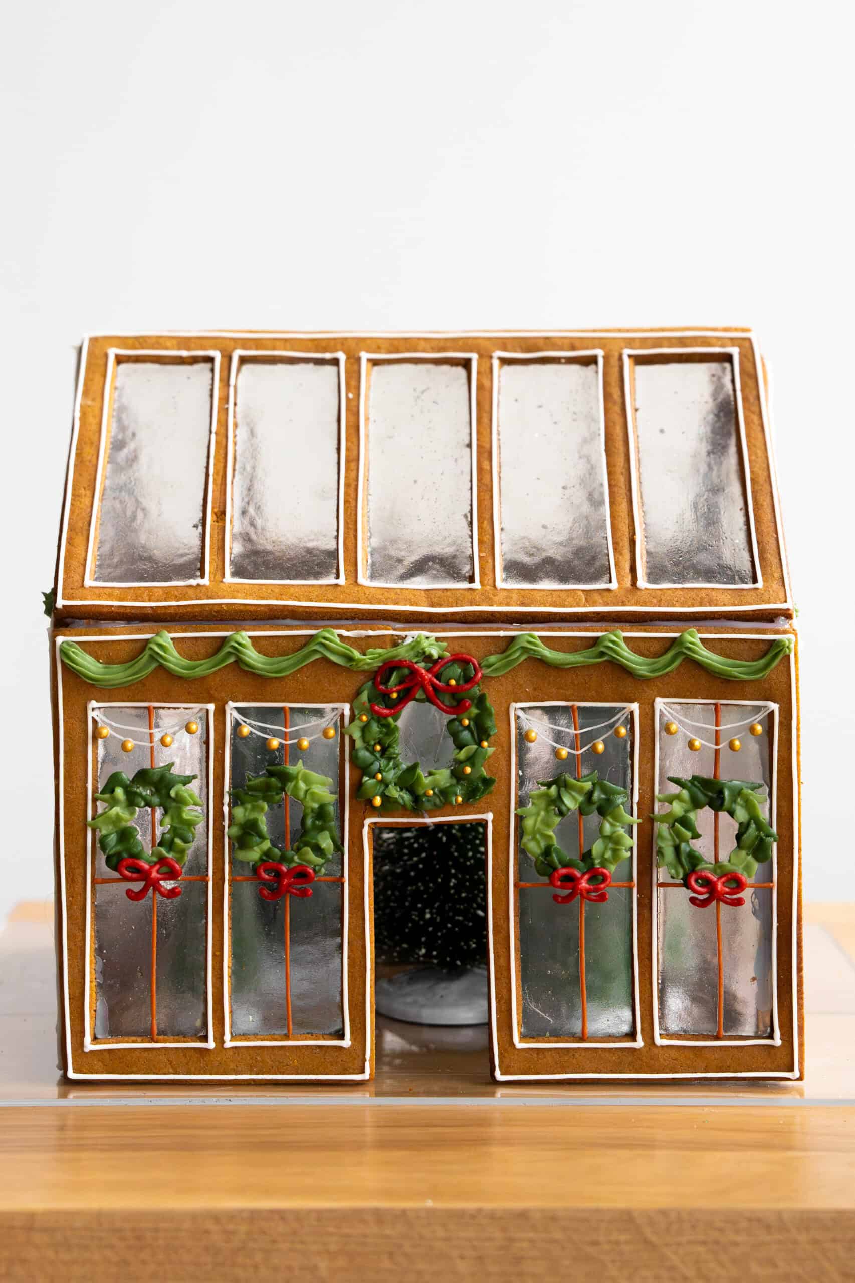 The steps and tips of making a gingerbread greenhouse still remain the same and you can find them in the original blog post, but I’ve updated the template for the gingerbread house so you can recreate it at home much more easily. It is now a to-scale, printable template that you can use to trace out each gingerbread panel so you can skip having to do all the math at home. I stepped up the decor a little this year and had lots of fun piping wreaths, garlands, and string lights for each panel. Another bonus of choosing isomalt over gelatin sheets is that you can decorate directly on the windows. The biggest tip I can give anyone who is wanting to make a gingerbread house is: always decorate before assembling.