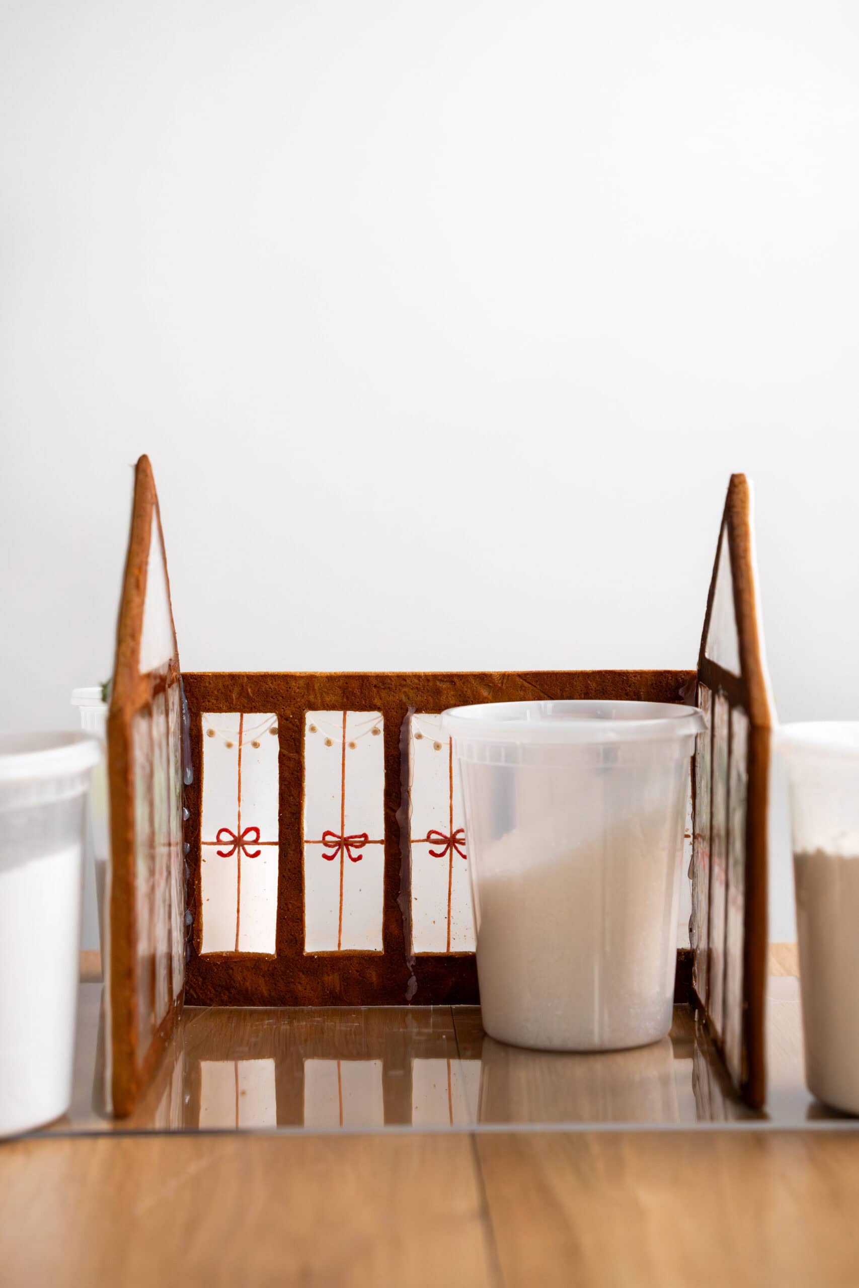 Instead of gelatin sheets, which I’ve used every year for gingerbread houses, I used isomalt for the windows. Isomalt is sugar substitute that is used in a lot of sculpted sugar work. I’ve used isomalt a lot in the past for my shaker cookies, but never for a larger cookie piece like this. Isomalt is also a good substitute for gelatin sheets because it reinforces the gingerbread panels, making them less prone to breaking during the building process. Isomalt, may seems scary to work with at first because you are dealing with very hot sugar, but the process is relatively simple. Isomalt gets melted in a pot over the stove (a very passive process) and is then left to settle in a low temperature oven for a couple minutes before being poured into the gingerbread cavities. Allow the isomalt to fully cool and harden before moving the gingerbread pieces. I like to use a little bit of vegetable oil to ‘polish’ the cooled isomalt to make them more shiny and see through.