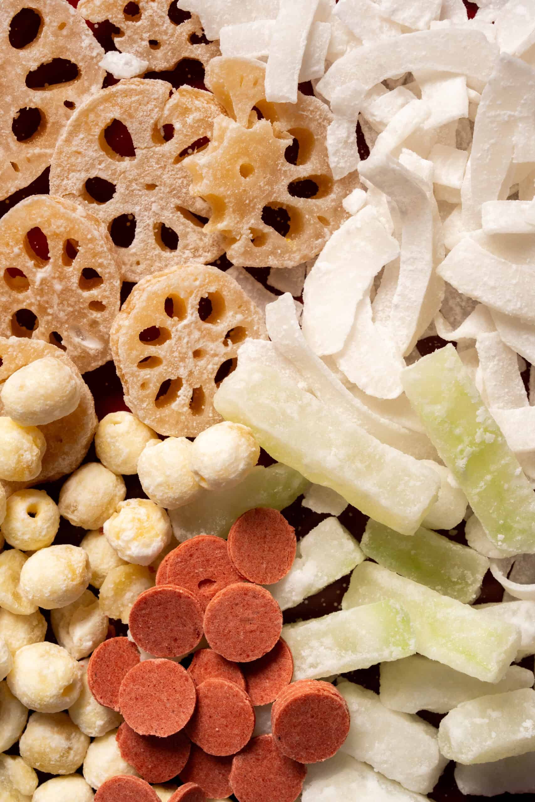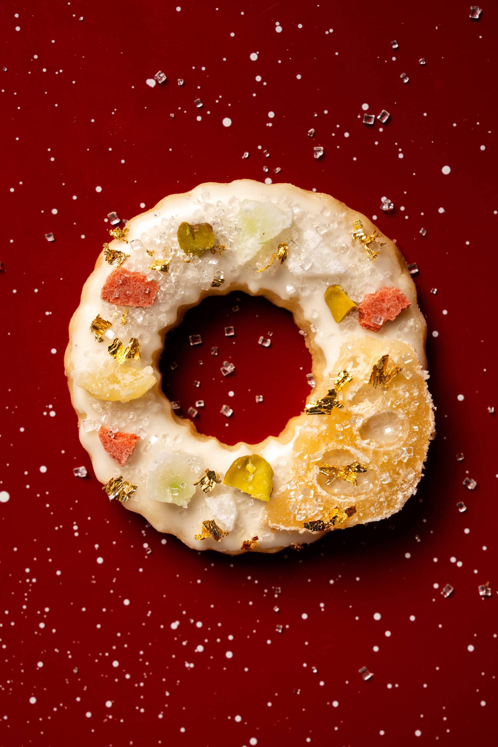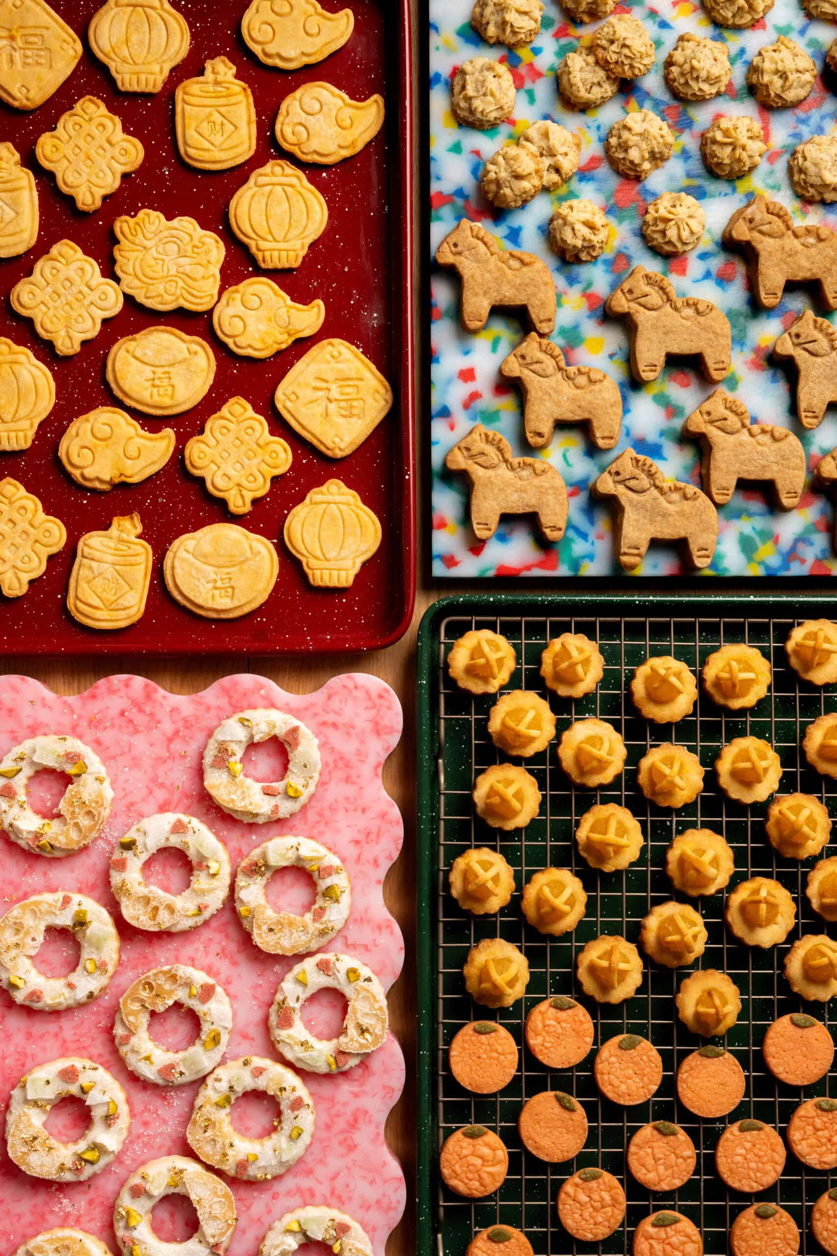 The ‘Tray of Togetherness’ cookie was the particularly meaningful for me. A ‘Tray of Togetherness’ can always be found on a Chinese New Year table because of all the significance it carries. The red and gold round tray holds snacks that each have unique well wishes for the new year — candied wintermelon for good health, pistachios for happiness dried coconut for family, candied lotus root for abundance, sesame balls for laughter, and more. It’s tradition for a tray of togetherness to have six compartments to house six types of sweets, so this shortbread cookie is topped with six kinds of ingredients you would find in a tradition tray. It’s then topped with gold for an extra layer of prosperity and fortune.