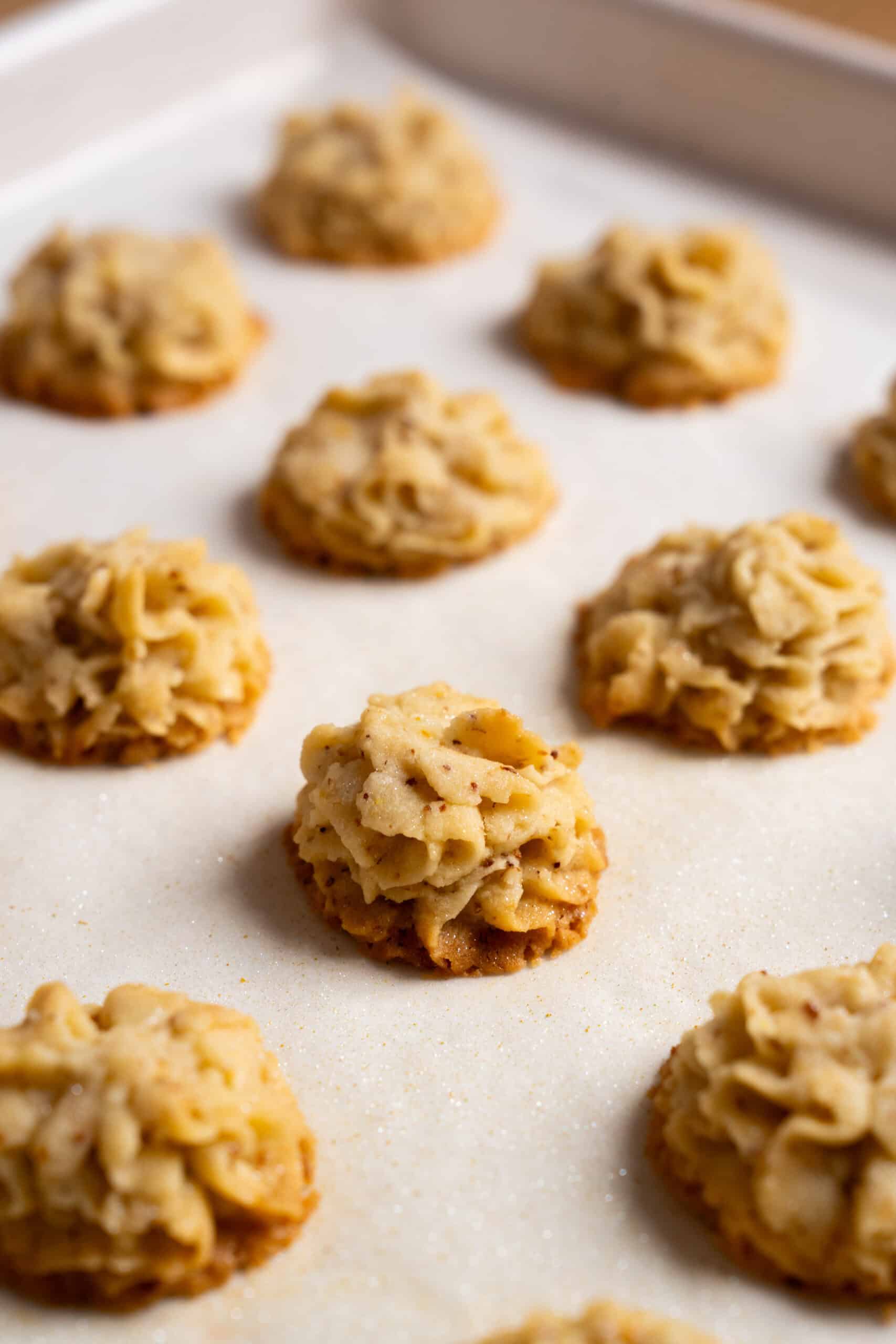 - Transfer the dough into a piping bag fitted with a large open star tip (I used wilton 2d). Apply pressure to pipe the dough onto the prepared baking sheet. If you are having trouble piping out the dough, you can warm up the dough in the piping bag between the palms of your hands, or add an extra 1 tbsp of melted butter to the dough and refill the piping bag. Leave 1 inch between each cookie.